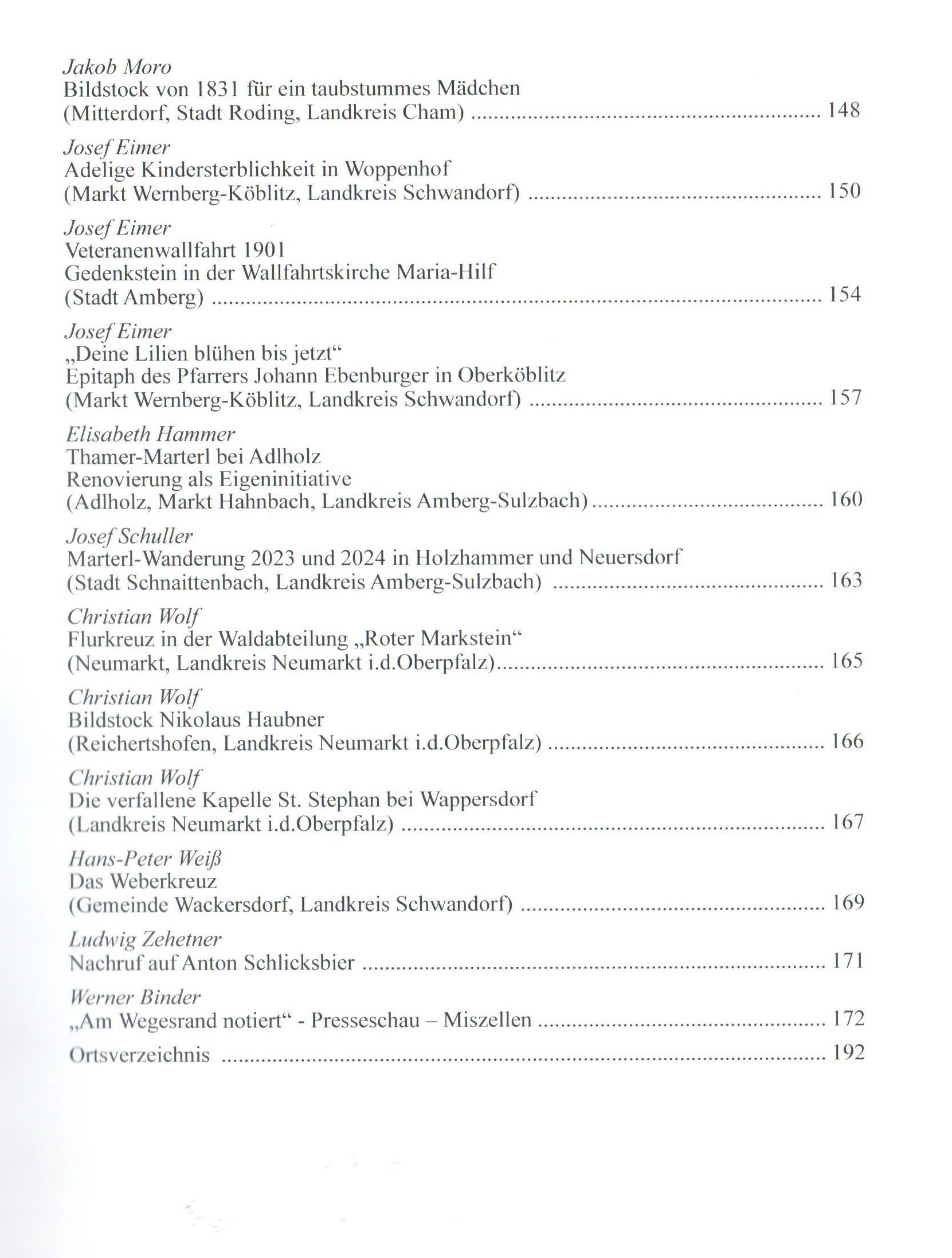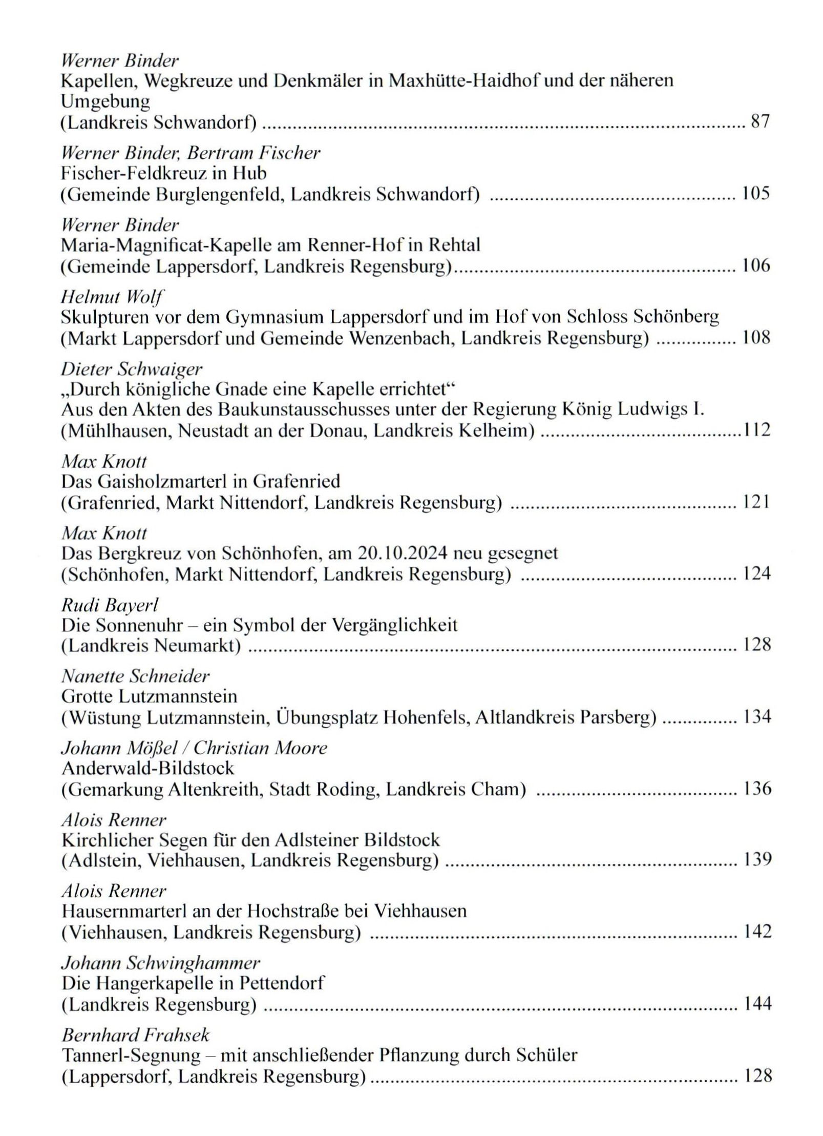 Walter Pilsak schließt in „Zauber des Friedens“ den Rundgang durch den Friedhof in Waldsassen ab. Rudi Wilhelm dokumentiert Arma-Christi-Kreuze als Besonderheit der religösen Kunstgeschichte. Berichte von Werner Binder, Armin Gugau und Jakob Moro bilden den Schwerpunkt „Kriegerdenkmäler“. Arno Stahl portraitiert die Dorfkapelle in Neuenreuth bei Kastl. Josef Eimer berichtet über „Adlige Kindersterblichkeit in Woppenhof“ und Christian Wolf dokumentiert Marterln, Feldkreuze und Kapellen im Landkreis Neumarkt. Insgesamt 37 Artikel zeichnen ein vielfältiges Bild von den Flurdenkmälern der Oberpfalz.