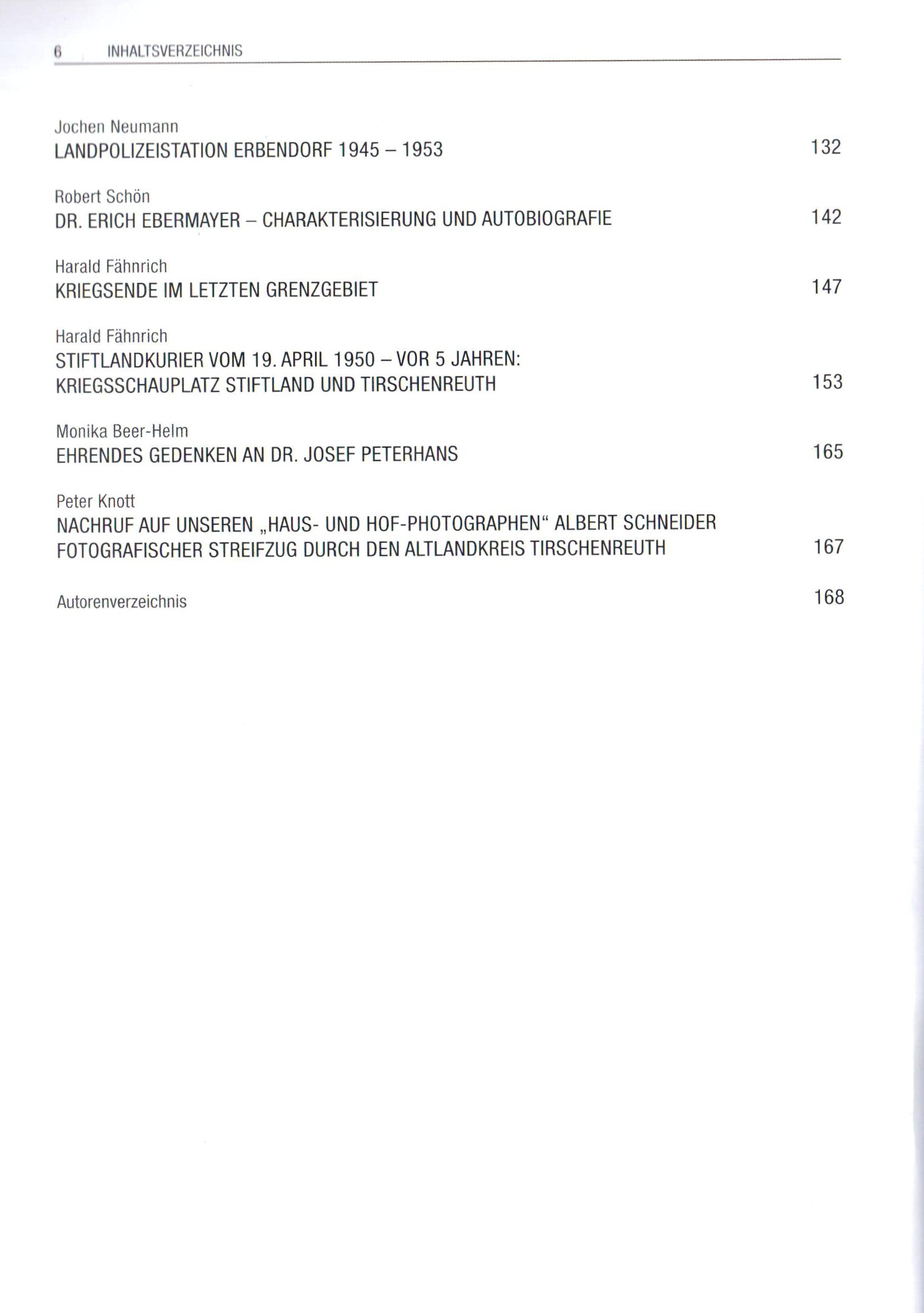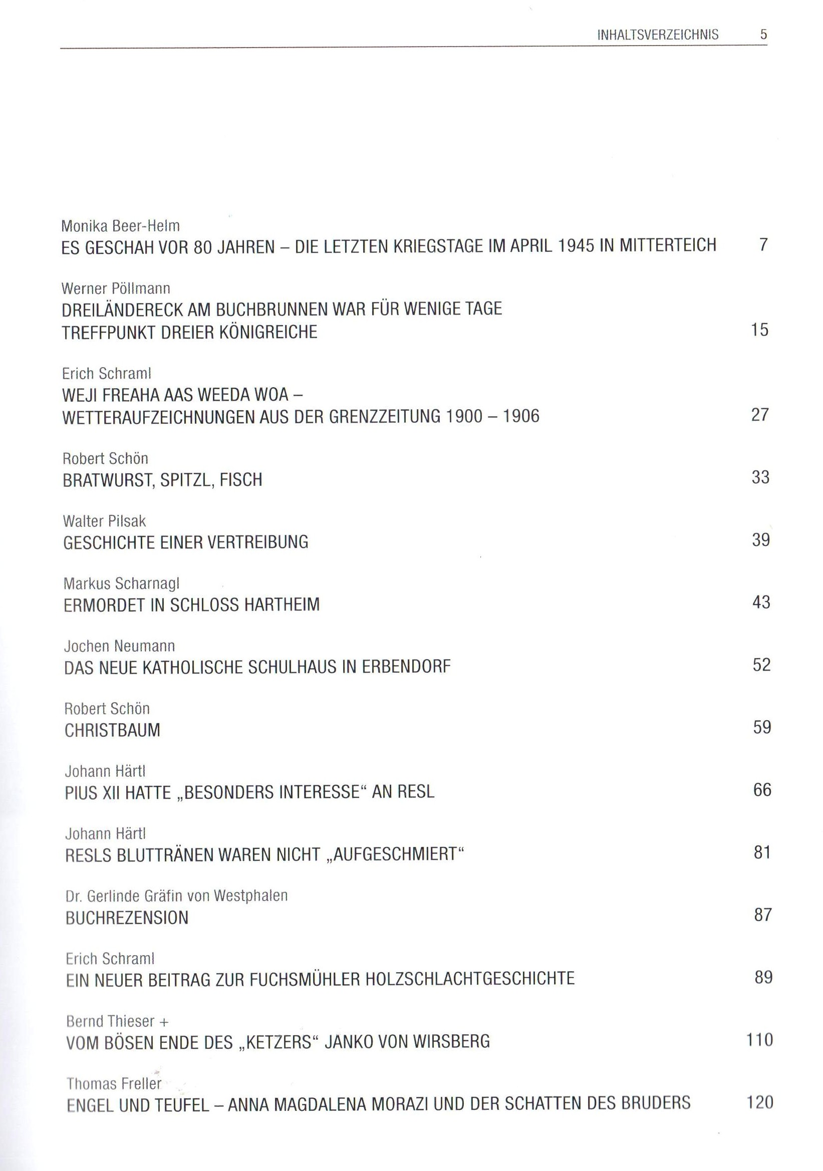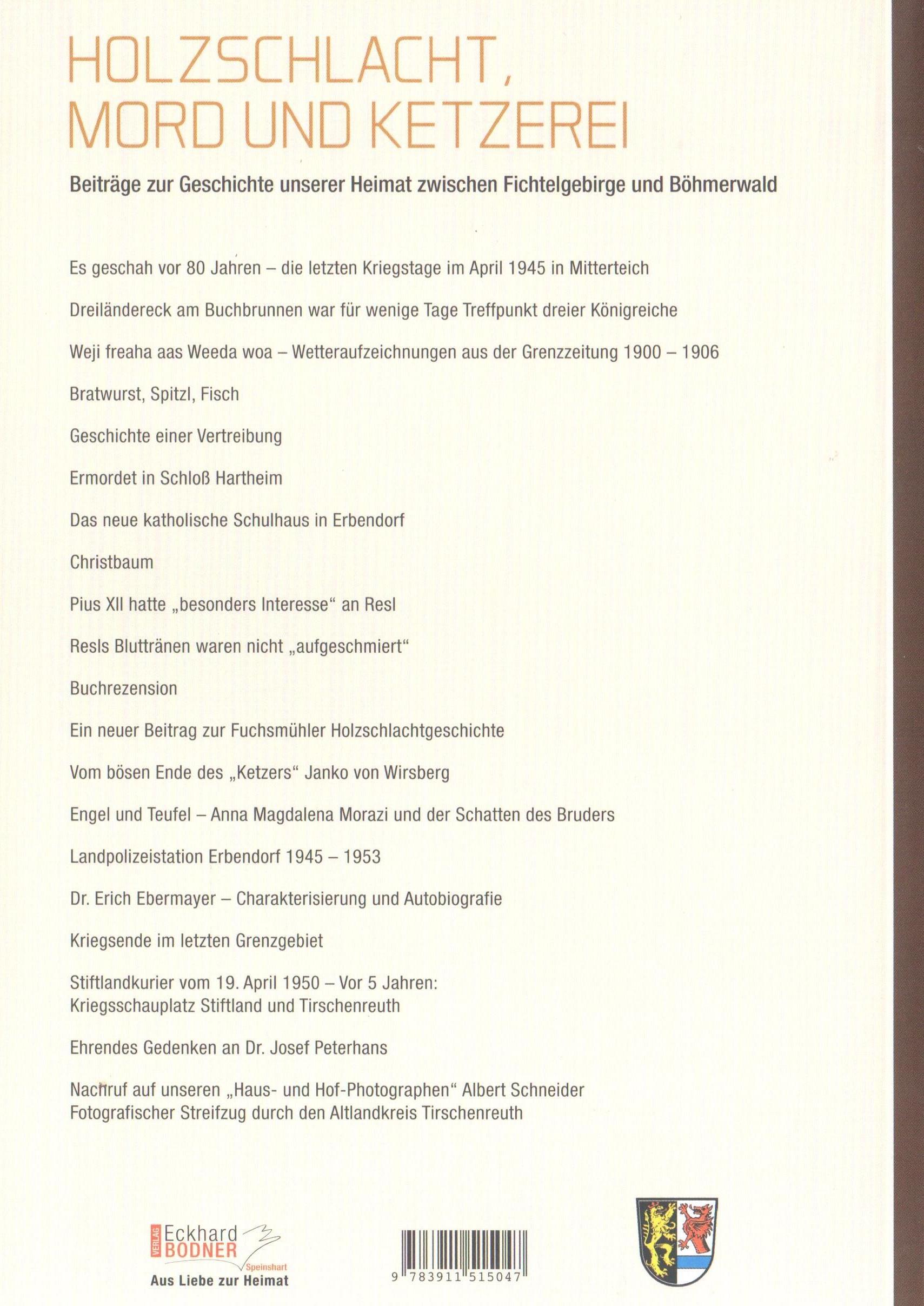 Der 36. Band bietet wieder 20 Beiträgen quer durch den Landkreis Tirschenreuth und darüber hinaus. Monika Beer-Helm berichtet über die letzten Kriegstage April 1945 in Mitterteich. Erich Schraml schildert die Wetteraufzeichnungen von 1900 bis 1906 in der „Grenzzeitung“. Die Geschichte einer Vertreibung stammt aus der Feder von Walter Pilsak. Bernd Thieser(+) zeichnet das Schicksal des Ketzers Janko von Wirsberg nach und Robert Schön portraitiert den Schriftsteller Erich Ebermayer auf Schloss Kaibitz. Beiträge zur „Resl von Konnersreuth“ dürfen natürlich auch nicht fehlen, diesmal stammen sie aus der Feder von Johann Härtl.