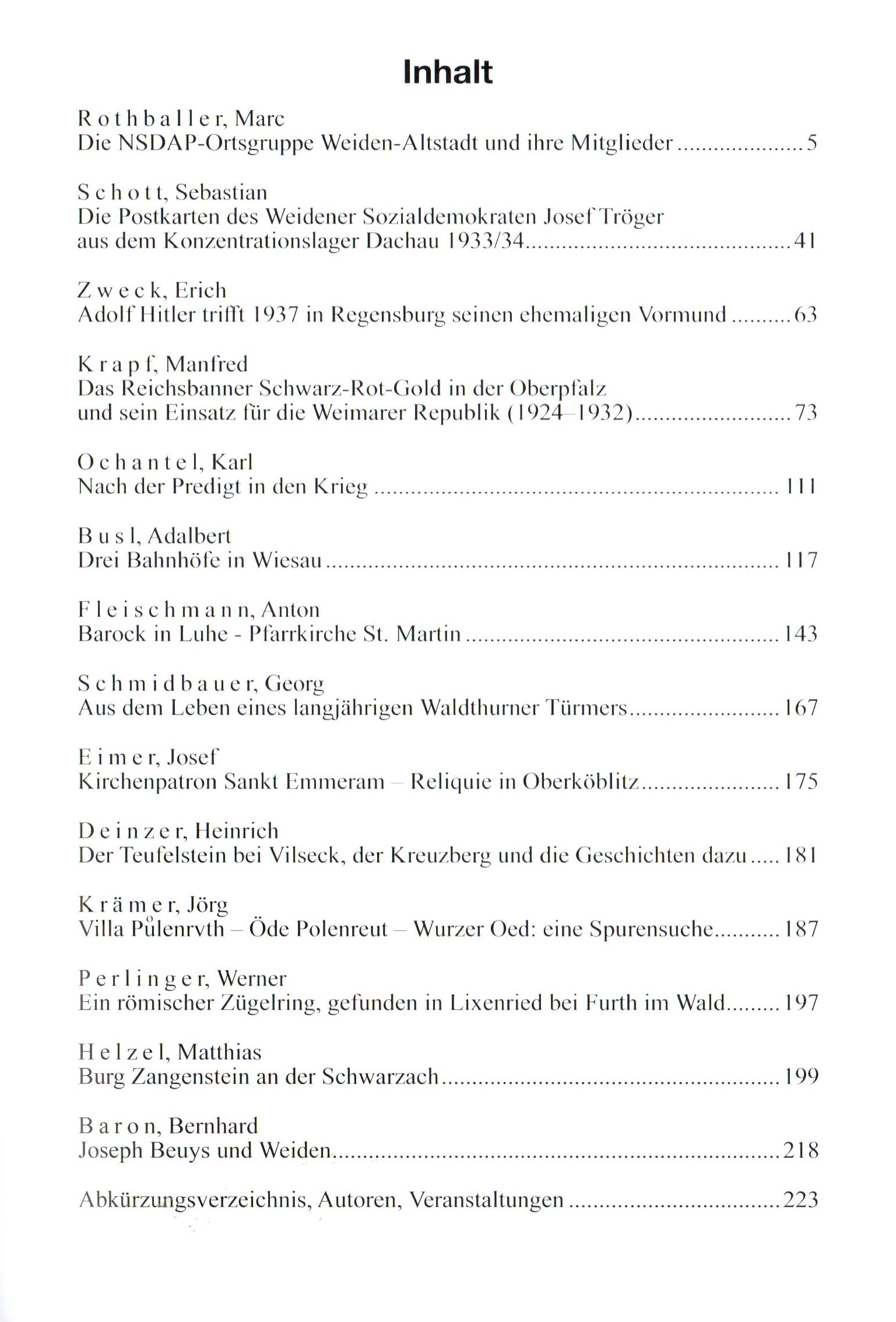 Die Jahresschrift aus Weiden bietet in 14 Artikeln Beiträge von der Römerzeit bis ins 20. Jahrhundert. Der Schwerpunkt des 70. Jahrgangs liegt aber eindeutig im vergangenen Jahrhundert und beleuchtet insbesondere die Zeit des Nationalsozialismus. Die Artikel beschäftigen sich u.a. mit der NSDAP-Ortsgruppe Weiden-Altenstadt und ihren Mitgliedern. Dr. Sebastian Schott analysiert die Postkarten des Weidener Sozialdemokraten Josef Tröger aus dem KZ Dachau in den Jahren 1933/34. Adalbert Busl beschäftigt sich mit den drei Bahnhöfen in Wiesau, GEorg Schmidbauer berichtet über das Leben des Waldthurner Türmers Bartholomäus Schriml in der ersten Hälfte des 19. Jahrhunderts. Jörg Krämer geht in seinem Artikel "Villa Pulenrvth - Öde Polenreut - Wurzer Oed" auf Spurensuche. Die Burg Zangenstein an der Schwarzach rekonstruiert der bekannte Burgenforscher Matthias Helzel aus Eschenbach. Insgesamt wieder eine wahre Fundgrube für Freunde der Oberpfälzer Geschichte.