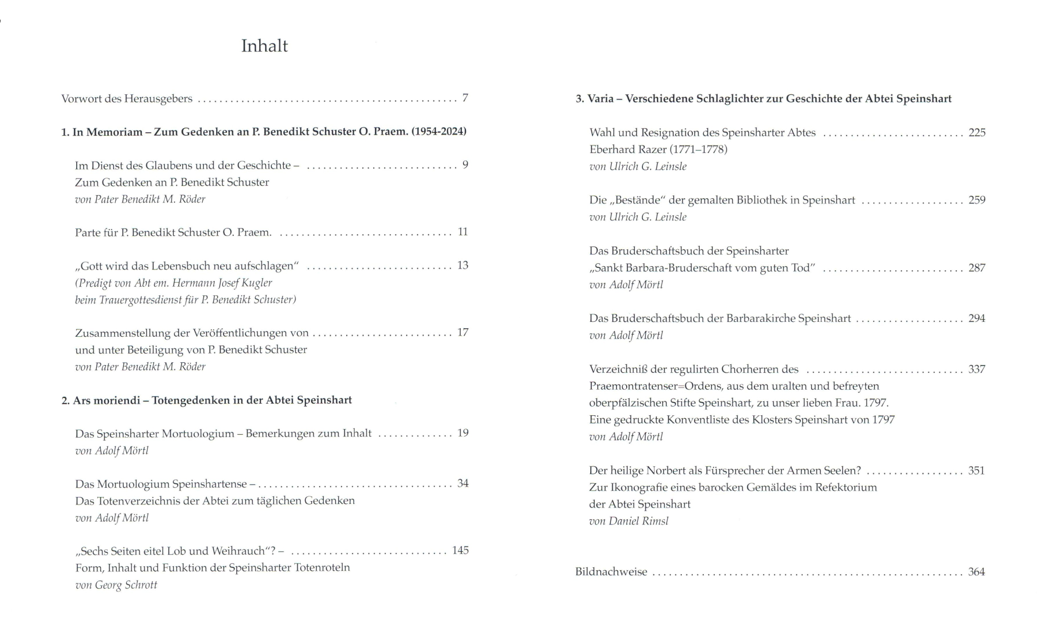 Auch nach dem überraschenden Tod von Pater Benedikt Schuster (Opraem) im Jahr 2024 wird die Reihe "Speinshartensia" in seinem Sinne fortgeführt. Große Teile der "Gemischten Beiträge" hat Pater Benedikt Schuster selbst noch auf den Weg gebracht, redigiert und betreut. Dass der vierte Band der Klosterschriften nun der Öffentlichkeit vorgestellt werden konnte ist Prof. Dr.Dr. Ulrich Leinsle zu verdanken, der auch schon die "Annales" betreut hat.