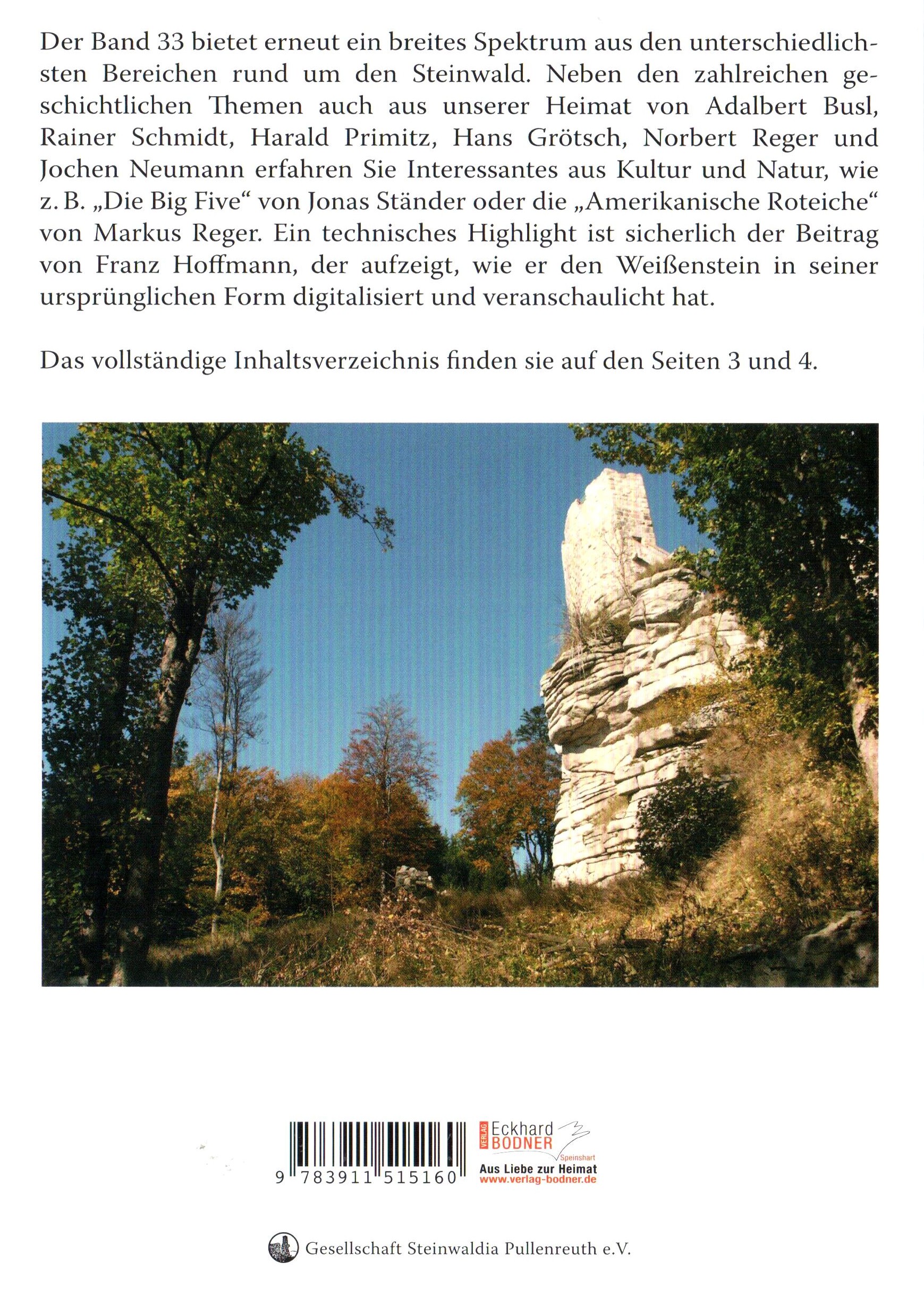 Der Band 33 bietet erneut ein breites Spektrum aus den unterschiedlichsten Bereichen rund um den Steinwald. Neben den zahlreichen geschichtlichen Themen aus unserer Heimat, erfahren Leser und Leserinnen auch Interessantes aus Kultur und Natur. So zum Beispiel von Jonas Ständer über die "Big Five" des Steinwalds oder ein Portrait der aus Nordamerika stammenden "Roteiche" von Markus Reger. Franz Hoffmann verrät, wie er die Burg Weißenstein in ihrer ursprünglichen Form digitalisiert und veranschaulicht hat. Das genaue Inhaltsverzeichnis finden sie beim "Blick ins Buch".